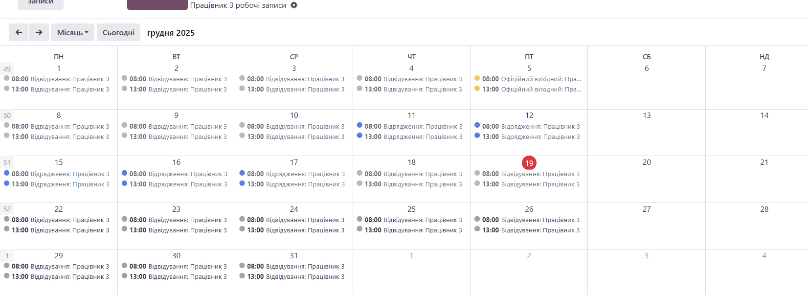 Листопад 2025 р. : Відрядження 9 днів, Відвідування - 11 днів.