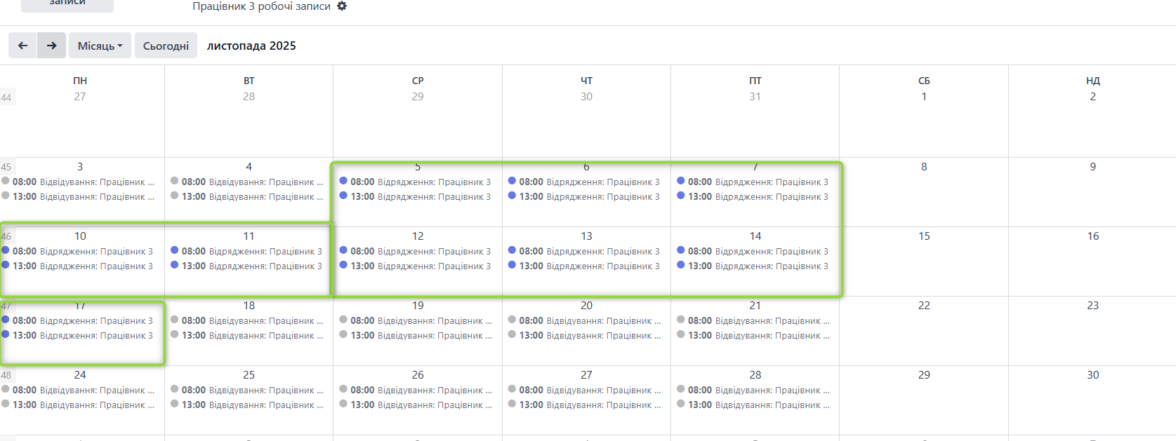 по працівнику автоматично формуються робочі записи типу «Відрядження»;