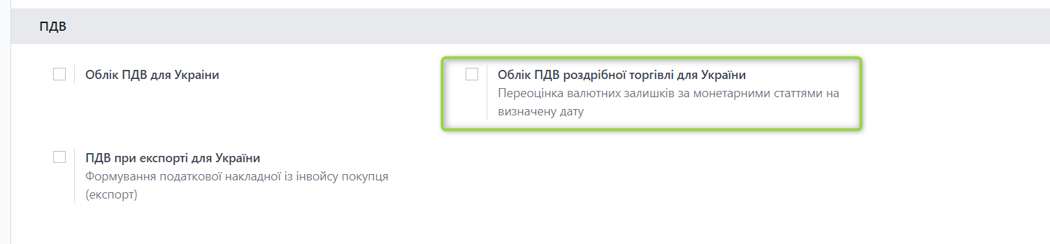 Налаштування / Облік для України / ПДВ / Обрати чекбокс "Облік ПДВ роздрібної торгівлі для України".